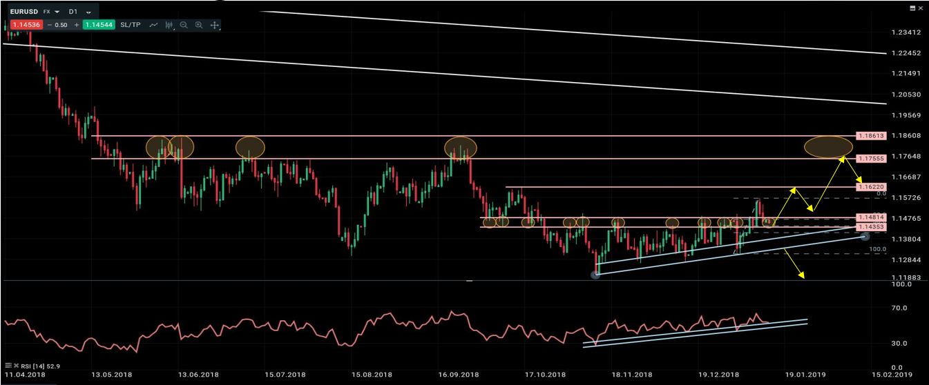 En el informe de la semana pasada comentamos que “la situación en torno a la Libra era la más incierta de todas debido a la votación el preacuerdo del Brexit mañana día 15 de enero en el Parlamento británico. Y que aunque parece muy difícil que se vaya a conseguir aprobar el preacuerdo del Brexit caben todo tipo de escenarios a partir de ahí. Establecimos varios escenarios que voy a actualizar ahora:” 1) que se apruebe el acuerdo en el parlamento, en cuyo caso espero que la libra rebote hacia 1.33, como muestra de una menor incertidumbre en el mercado. Escenario 2) que no se apruebe el preacuerdo, Theresa May sigue gobernando y la separación con la UE se haga sin un acuerdo marco. Este es el entorno que considero peor, porque tendría efectos desastroso en términos económicos, y porque la prima de riesgo se dispararía. Si ocurre esto, espero que la libra se hunda, y probablemente alcance objetivos de 1.15 primero y 1.08 a medio plazo. Escenario 3) que no se apruebe el preacuerdo y que Corbin lance una moción de censura contra May que la obligue a dimitir. Si el nuevo Primer Ministro se atreviese a dar marcha atrás y convocar un segundo referéndum, el mercado descuenta una alta probabilidad de que UK no abandone la UE, lo que provocaría una fuerte apreciación de la Libra, con un primer objetivo en 1.32/1.33 y un potencial objetivo a medio/largo plazo hacia 1.4350/1.44 (niveles anteriores a la celebración del primer referéndum).