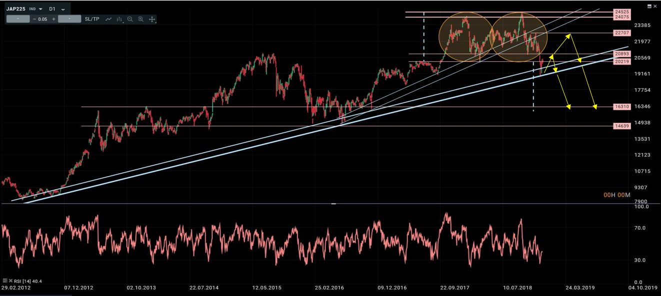En el informe anterior comentamos que “el Nikkei había completado una formación de vuelta tipo doble techo cuyas implicaciones era claramente bajitas. Y que lo único positivo era que todavía seguía intacta la directriz alcista que se inició en 2012. Barajamos tres posibles escenarios: 1) que el rebote de la última semana tan solo fuese un “pullback” al “neckline” y que por tanto no se produjeran extensiones por encima de 20900 antes de retomarse la presión vendedora con objetivo final en 16000. Escenario 2) que el rebote se extendiera por encima de 20900, lo que abriría la posibilidad de subidas hacia 22700, (último máximo decreciente). Pero en cualquiera de los casos, dijimos que mientras no se superase este techo, el riesgo a la baja seguía intacto por lo que había que buscar oportunidades de venta”. No ha habido ningún cambio significativo en nuestro análisis por lo que mantenemos la misma idea que la semana pasada.