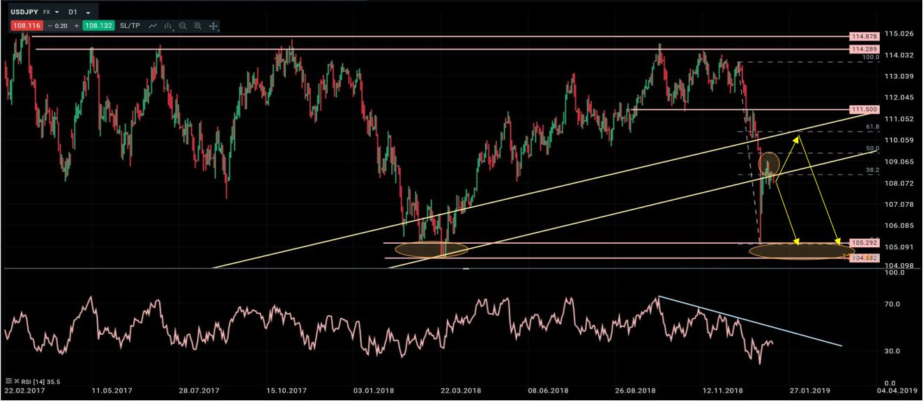 La semana pasada comentamos que “el yen había actuado como activo refugio durante el desplome de la bolsa en el mes de diciembre, y su fortalecimiento había provocado daños graves a la estructura alcista de largo plazo. Lo primero que detectamos fue que la pérdida de 111.50 completó una formación de vuelta tipo “doble techo”. Lo segundo que había ocurrido era la perforación de la línea de tendencia que arrancaba en los mínimos de 2011. Por eso dijimos que a partir de ahí el entorno se había vuelto mucho más negativo, y que debíamos vigilar el soporte en torno a 104.85/00 porque representaba el último mínimo creciente importante a nivel semanal, y en el caso de perderse implicaría que lo más probable era que la caída continuase hasta alcanzar niveles de 99.40/101.00. Por ese motivo dijimos que si por alguna circunstancia el precio rebotaba durante las próximas sesiones hasta 111.50 aprovecharía para abrir posiciones cortas”. Técnicamente la situación no ha cambiado mucho respecto a lo que comentamos hace 7 días. Tras una recuperación hasta el 38-50% de Fibonacci, un potencial “pullback” a la directriz rota, ausencia de divergencias alcistas o formaciones de vuelta….el escenario que considero más probable es un nuevo ataque a la zona de mínimos previa.