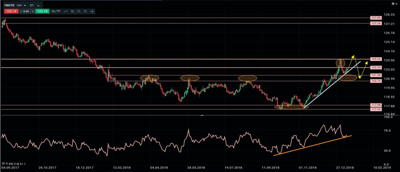 La semana anterior comentamos que “técnicamente, el Tnote había roto la primera zona de resistencia en torno a 121 y se había extendido con rapidez hasta su segundo techo en 122.25/123.22. Dijimos que dada la verticalidad de la subida, y la importancia de la resistencia, esperábamos un rechazo de este techo a corto plazo, que diese paso a una consolidación lateral entre 120.60 y 123.22 durante las próximas semanas. Y que mientras no se produjeran cierres semanales por encima de 123.22 el entorno a medio plazo seguía siendo bajista, con un primer objetivo potencial en 120.60 y un segundo objetivo en 118.00. Solo en el caso de que el bono acabara cerrando por encima de 123.22, implicaría que la fase de rebote aun no había concluido, y en ese caso podríamos ver extensiones hacia 125.00/125.40”. Durante la semana pasada hemos visto un rechazo de la zona de resistencia y un acercamiento al área de soporte. Creo que el escenario más probable es un periodo de consolidación lateral tal y como planteamos en nuestro último informe. A corto plazo se mantiene intacta la tendencia alcista tanto en RSI como en precio, y no se aprecian estructuras de vuelta bajistas, por lo que espero un nuevo ataque a la zona de techos establecida en torno a 123.20.