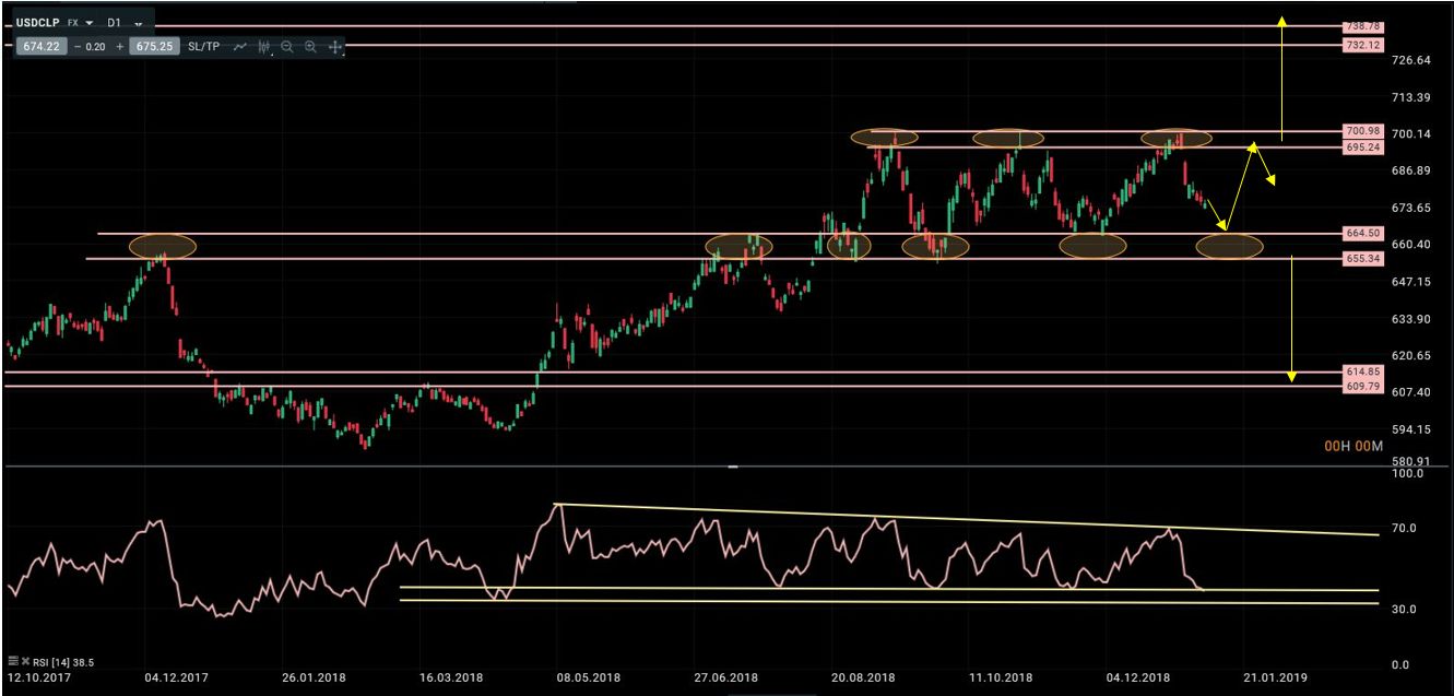La semana pasada comentamos que “el usdclp había entrado en una fase de consolidación lateral entre 655 y 701. Pese a los intentos de ruptura de la zona de máximos los indicadores técnicos seguían generando divergencias bajistas lo que hacía probable que el periodo lateral se extendiera un tiempo más. También dijimos que la salida de este rango determinaría el próximo movimiento tendencial fuerte. Y que en el caso de que se consolidasen cierres por encima de 701 esperábamos una primera extensión hacia 732/740. Mientras que si se producían cierres por debajo de 655 la fase lateral actual se convertiría en una formación de vuelta bajista, lo que implicaba caídas a medio plazo hacia la zona 610/615”. Nada ha cambiado durante los últimos 7 días salvo que se está produciendo la rotación a la parte baja del rango. Por tanto mantenemos nuestros escenarios tal y como estaban diseñados hace una semana.
