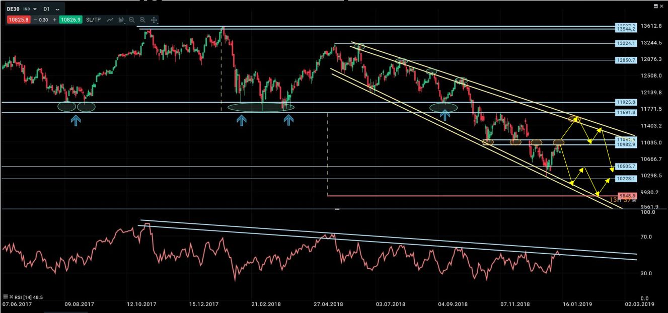 En el informe anterior comentamos que “el DAX había completado en 2018 una formación de vuelta tipo h-c-h y la ruptura de la directriz alcista de largo plazo. Desde entonces tenía activado un objetivo en torno a 9850. Y que dado que no se apreciaban divergencias semanales que advirtieran de un potencial rebote inminente, mientras el índice cotizase por debajo de 11090/11100 el entorno continuaba siendo claramente bajista tanto a corto como a medio plazo”. El Dax ha rebotado durante las últimas sesiones hacia su primera zona de resistencia fuerte y los indicadores técnicos han pasado de zonas de sobreventa a lecturas de sobrecompra o neutrales. Siguen sin desarrollarse figuras de vuelta y el RSI comienza a rechazar la directriz bajista de medio plazo. Con estas señales el escenario más probable es un nuevo impulso bajista hacia la zona 10100-10500. Para reducir la presión negativa sería fundamental que el precio cierre por encima de 11100, y solo en ese caso nos plantearíamos extensiones hacia 11500/700.