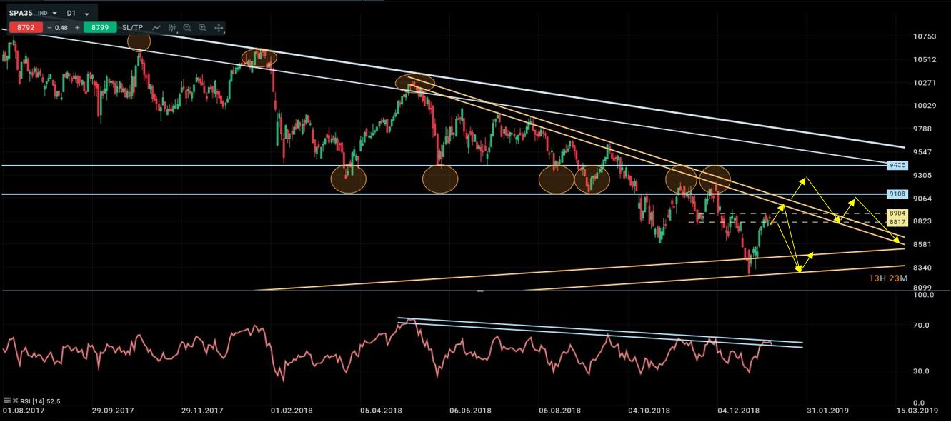En el último informe comentamos que “el IBEX comenzó su deterioro a principios de 2017 y se acelero a partir de 2018 con la pérdida del soporte en 9100. Y que la caída registrada en diciembre, había llevado al índice a retestear la directriz alcista que se originó en 2011. Pero que a diferencia del DAX, el IBEX si mostraba divergencias alcistas en los indicadores técnicos semanales, lo que podía ser un primer síntoma de que no estamos lejos de un rebote algo más duradero tanto en tiempo como en extensión”. El rebote de las últimas dos semanas ha llevado al IBEX hasta la zona pivote entre 8817 y 8904, y al RSI a su directriz bajista. Con estas señales me cuesta mucho ver extensiones al alza adicionales a corto plazo (en el mejor de los casos un potencial ataque a la directriz bajista del precio en 9030-40). Por lo que creo que el escenario más probable es un nuevo impulso hacia la zona de mínimos anterior. A medio/largo plazo, mientras el índice cotice por debajo de 9400 el escenario continúa siendo claramente bajista.