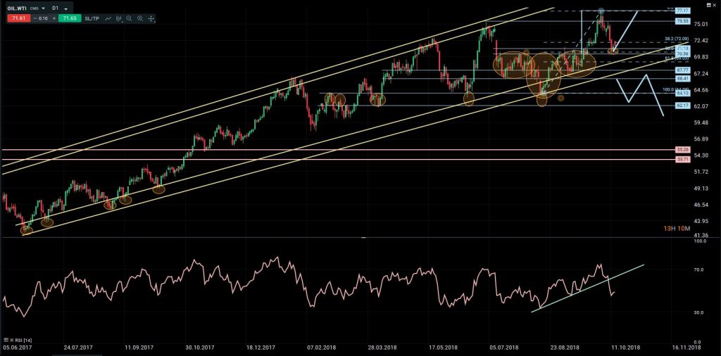 En el último informe comentamos que “había que seguir en un entorno de comprar las correcciones. Y que aprovecharíamos si se dan vueltas a 70.60/80 para comprar con objetivo en 77.30 y stops por debajo de 66.40”. De momento la caída del petróleo ha respetado nuestra zona de compra en torno al 50% de corrección de Fibonacci y antigua área de máximos previos. Desde aquí espero que se retome un nuevo impulso con un primer objetivo en los techos anteriores en torno a 77.15/20. A largo plazo cada vez son más importantes las divergencias bajistas que se están desarrollando, por lo que habrá que ser cada vez más cautos y fijar los stops en previsión de un potencial cambio de tendencia durante las próximas semanas. Mientras el precio se mantenga por encima de 66.40 el escenario positivo sigue siendo el que más sentido tiene.