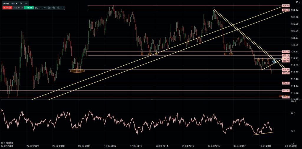 En nuestro último informe comentamos que “nos encontrábamos en la parte inferior del soporte crítico y que desde aquí podrían producirse algunos rebotes tácticos. Pero que la visión general no había cambiado y había que aprovechar los rebotes para vender ya que era muy probable que el precio acabase atacando 114.90 a medio plazo”. El soporte sigue de momento intacto y están apareciendo potenciales divergencias alcistas en los indicadores semanales. Esto incrementa el riesgo de un potencial rebote a corto plazo. Sin embargo, la estructura de vuelta (doble techo) y la directriz bajista que se inició a mediados de 2016 sigue intacta, por lo que en el caso de rebotes habría que aprovechar para vender con un primer objetivo en 114.90 y un objetivo a largo plazo hacia la zona de 111.20/30. Para invalidar este escenario harían falta cierres por encima de 123.20.