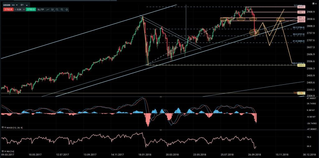 En el último informe comentamos que “en las últimas dos semanas se había formado un pequeño “doble techo” y se había roto la directriz alcista más acelerada. Este movimiento a la baja lo considerábamos una corrección, y por tanto, una oportunidad de compra. Proponíamos aprovechar caídas hacia 2845-2867 para abrir posiciones largas con dos objetivos: en 2945 y 3000 y con un stop por debajo de 2790”. La caída termino siendo mucho más intensa de lo inicialmente previsto. El desplome ha encontrado soporte en torno al 50% de corrección de Fibonacci que coincide con la directriz alcista que se origina a finales de 2015. Sin embargo, cuando se producen este tipo de caídas bruscas lo normal es que no finalicen en “V” sino que se compongan de un rebote seguido de un nuevo proceso de debilidad. Es decir, que podríamos ver cierta estabilización a corto plazo y mejora en el comportamiento del precio pero a continuación tendríamos un segundo impulso a la baja. Esta nueva caída será crucial, ya que si deja un mínimo creciente tendría implicaciones positivas y podríamos volver a trabajar con un escenario de atacar máximos históricos de nuevo de aquí a fin de año, mientras que si la caída tras el rebote marca un nuevo mínimo descendente el daño a la estructura gráfica sería grave, y podría estar marcando el final del “bullmarket” de la bolsa estadounidense.