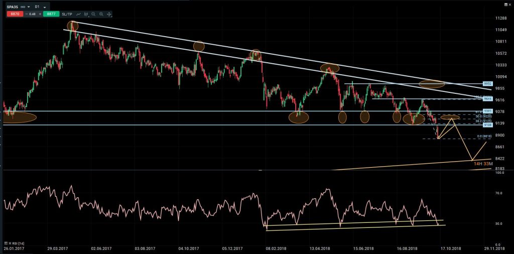 En el último informe comentamos que “el IBEX tenía un soporte muy importante en 9100. Y que mientras no se rompiera dicho suelo podíamos mantener nuestra visión constructiva en el corto plazo, con un primer objetivo potencial en 9640/50 y un objetivo final en 9900. Pero también dijimos que cierres semanales por debajo de 9100 abrirían extensiones a la baja hacia 8525/8615”. Finalmente el IBEX ha roto la zona de soporte provocando un deterioro significativo a la estructura de medio/largo plazo. La tendencia en el RSI sigue intacta, lo que puede acabar generando divergencias alcistas a corto plazo. En este caso espero un rebote hacia 9100-9220, pero habría que aprovechar esta subida para vender, ya que espero que se mantenga la secuencia de máximos y mínimos decrecientes y que el próximo impulso bajista tenga como objetivo la zona 8525-8616.
