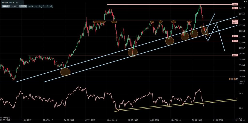 En el último informe comentamos que “la zona comprendida entre 22930 y 23100 representaba un nivel de soporte fuerte, y la tendencia principal seguía siendo claramente alcistas. Por tanto, proponíamos aprovechar si la corrección alcanzaba 22900-23100 para comprar, con un objetivo entre 24150 y 24450. Dijimos que a largo plazo, mientras no se rompiese la directriz alcista que pasa por 22000, el escenario seguía siendo claramente positivo”. A raíz del desplome vivido en la bolsa estadounidense, el Nikkei ha caído con fuerza perforando claramente el primer nivel de soporte. Sin embargo, la tendencia alcista sigue estando intacta. Por tanto, de momento el daño a la estructura de medio/largo plazo ha sido de momento mínimo. Mientras el precio no caiga por debajo de 21845 considero probable que se restablezca la tendencia con un nuevo rebote por encima de 23000. Por el contrario, cierres por debajo de 21400 cambiarían el entorno y habría que pensar en futuras proyecciones hacia 20300.