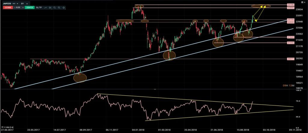 En el último informe comentamos que “mientras no se produjeran cierres por debajo de 21840 seguíamos en un entorno claramente alcista, por lo que había que aprovechar rotaciones hacia la línea de tendencia alcista para comprar. Además decíamos que por encima de 23105 esperábamos extensiones hacia los máximos de 2017 de nuevo”. Tras una corrección la semana pasada hasta nuestra zona de compra, el Nikkei ha subido con fuerza rompiendo la resistencia en torno a 23000. El objetivo sigue siendo la zona de máximos de finales de 2017, principios de 2018 en torno a 24000/100. A corto plazo podría producirse algún “pullback” hacia 22900/23000 lo que representaría una buena oportunidad de compra para los traders de corto plazo.