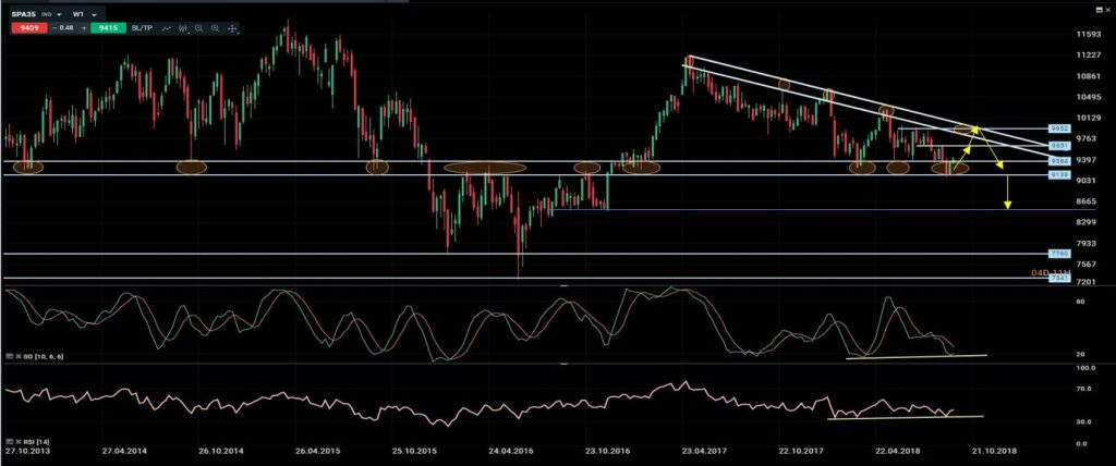 En el último informe comentamos que “el gráfico semanal ponía de manifiesto la importancia de la zona pivote que venía funcionando desde 2013. Entre 9166 y 9384 había una gran zona de soporte que mientras no se rompiese permitía tener confianza en un potencial rebote hacia 9650 primero y 9900/10.000 en el mejor de los casos.” De momento la zona de suelos sigue funcionando y hay potenciales divergencias alcistas desarrollándose tanto en estocástico como en RSI. A corto/medio plazo sigo esperando rebotes alcistas. Aprovecharía la zona 9650 para cerrar parcialmente las posiciones de compra y 9900 para cerrarlas completamente. En el caso de que no se produzca este escenario alcista, habrá que estar muy pendientes a posibles cierres semanales por debajo de 9100 ya que en ese caso tendríamos señales claramente bajistas y habría que cambiar la visión positiva que aun mantenemos.