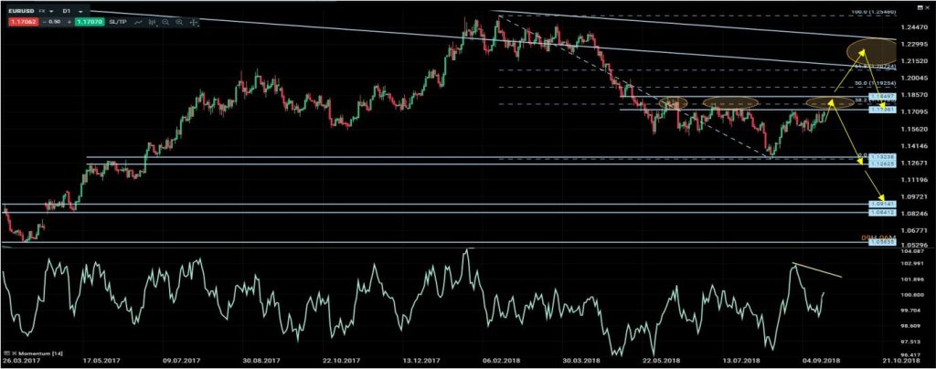 En el último informe comentamos que “a corto plazo estábamos inmersos en un proceso bajista que se inició en 1.2500 y que de momento había alcanzado un mínimo de 1.1300 confirmando nuevos mínimos decrecientes. El rebote actual se estaba acercando mucho a una zona de resistencia fuerte donde se encontraba el 38.2% de corrección de Fibonacci de todo el impulso bajista previo. Hablamos de que esta zona representaba un buen punto para vender, con stop por encima de 1.1870 y un primer objetivo en 1.1300/15 y un segundo objetivo en 1.0900/15.” El proceso de rebote sigue intacto y se está acercando a nuestra zona de resistencia. Viendo el comportamiento del indicador de “momento”, es muy probable que incluso en el caso de una extensión mayor hacia 1.1800, acabe generando divergencias bajistas. Por tanto, la idea es seguir con un sesgo vendedor. En el caso de que el precio cerrase por encima de 1.1870, existe un alto riesgo de extensión al alza hacia la zona de 1.2150/1.2300, donde nos encontraríamos con la parte superior del canal bajista semanal y por tanto con una fuerte resistencia que invita a vender de nuevo..