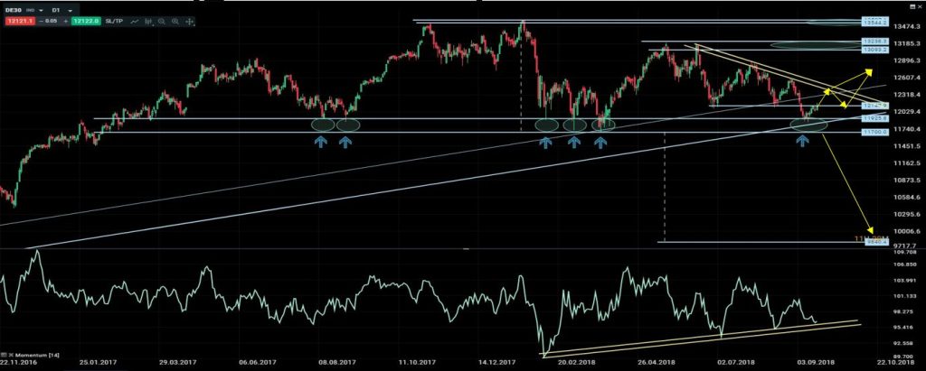 En el último informe comentamos “para los traders más agresivos la zona de compra se situaba entre 12100 y 12150 con un primer objetivo en 12850 y un objetivo final en 13000/13200. Y que para los traders más conservadores, esperaría acercamientos a 11800/925 para comprar con los mismos objetivos anteriores. También dijimos que para mantener nuestra visión positiva era primordial que no se rompiese el soporte en torno a 11700. Ya que si se producían cierres semanales por debajo de 11700 se completaría una formación de vuelta tipo h-c-h y se perdería la directriz alcista de medio plazo. Y en ese caso daríamos por concluida la tendencia alcista que ha durado desde 2009 y habría que vender con un primer objetivo en 9840.” De momento el precio respeta la zona crítica y se aprecian algunas divergencias alcistas potenciales en indicadores como el “momentum”. Dado el deterioro gráfico de corto plazo (máximos y mínimos decrecientes) aprovecharía rebotes hacia 12460, donde se encuentra la directriz bajista, para reducir parcialmente las posiciones largas.