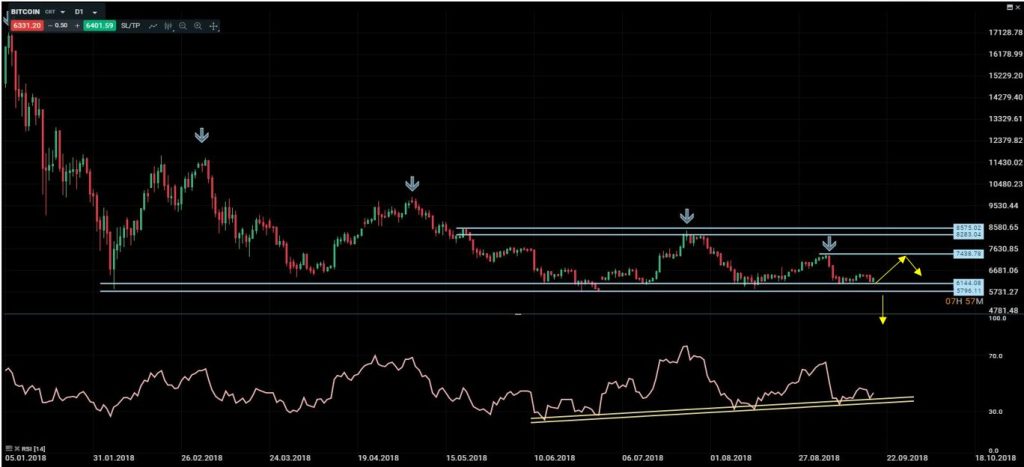 En el último informe comentamos que “el soporte principal seguía siendo 5800/6144 y que mientras aguantase esta zona se podían buscar oportunidades de rebote dentro del rango 5800-8500. A largo plazo, si viésemos cierres por debajo de 5540 sería muy negativo dada la estructura de máximos decrecientes desde finales de 2017. En ese caso habría que esperar extensiones hacia 3000.” Tras el rebote hasta 7430, el precio ha vuelto a rotar hacia la zona de soporte crítica. Aprovecharía la zona comprendida entre 5800 y 6000 para abrir posiciones largas, con stops por debajo de 5700 y objetivos en 6950 y 7290.