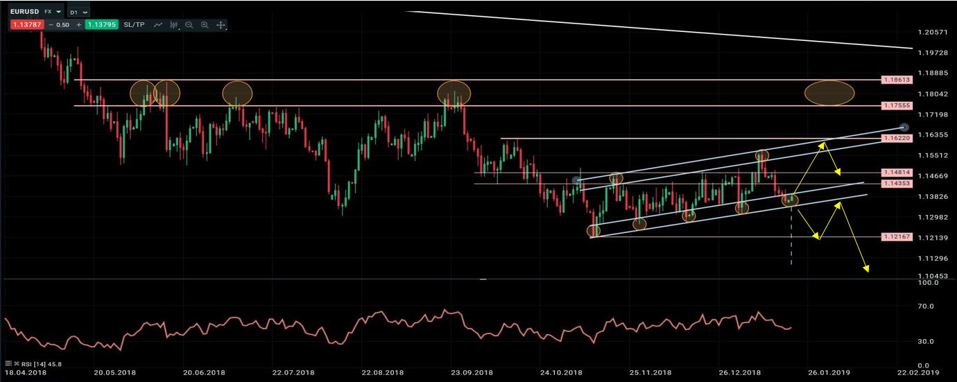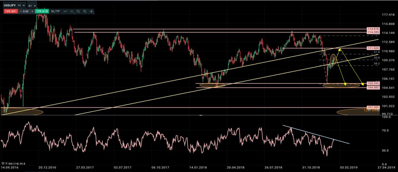 En nuestro último informe comentamos que “el precio había superado una resistencia importante con una vela muy positiva que cerró por encima de 1.15. Y que la caída posterior hacia la zona del 38-50% de Fibonacci se podía interpretar como un “pullback” a la antigua zona de resistencia. Por ese motivo nuestro escenario central era alcista, con un primer objetivo en 1.1615/20 y un objetivo final en la zona de 1.1750/1.1850. Dijimos que tan solo la pérdida de la directriz que une los mínimos crecientes desde principios de noviembre invalidaría nuestra visión de rebote en el Euro contra el Dólar y que aunque la tendencia estructural continuaba siendo claramente bajista, a corto plazo éramos positivos porque el dólar se había mantenido “demasiado” fuerte teniendo en cuenta lo que había ocurrido en el mercado de bonos tras los comentarios del presidente de la FED”. La semana pasada asistimos a un continuo fortalecimiento del dólar contra el euro en contra de lo que teníamos previsto, provocando que la zona entre 1.1450 y 1.1500 no aguantase. Estas situación nos obliga a replantear nuestro escenario, ya que si bien es cierto que no hemos visto que se rompa la línea que une los mínimos crecientes desde principios de noviembre de 2018, la reacción tras la ruptura de 1.1500 no es un síntoma de fuerza. Nuestro nuevo escenario ahora deja un objetivo al alza en el mejor de los casos hacia 1.1605/25, siempre y cuando no se rompa la estructura alcista en forma de canal de corto plazo. En el caso de cierres por debajo de 1.1310 lo más probable es un nuevo ataque a 1.1216 primero y a 1.1100/10 después.