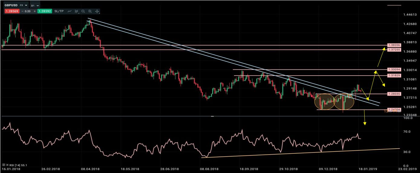 En el informe de la semana pasada comentamos que “la situación en torno a la Libra era la más incierta de todas debido a la situación del Brexit. Establecimos varios escenarios que voy a actualizar ahora:” 1) que se apruebe el acuerdo en el parlamento, Escenario 2) que no se apruebe el preacuerdo, Theresa May sigue gobernando y la separación con la UE se haga sin un acuerdo marco. Escenario 3) que no se apruebe el preacuerdo y que Corbin lance una moción de censura contra May que la obligue a dimitir”. Finalmente el camino que se tomo fue la opción 3, pero la oposición no consiguió la mayoría suficiente para hacer prosperar la moción de confianza. Eso nos deja en una situación de incertidumbre máxima, a la espera de que May presente un “plan B” que se votará a finales de este mes. Dado que no sabemos que es lo que va a ocurrir resulta imposible hacer un pronóstico claro en el par. Pero si podemos establecer cuales serían los escenarios extremos para estar preparados: 1) una salida de UK sin firmar el Brexit tendría efectos muy negativos en la libra, probablemente veríamos caídas hacia 1.15 primero y luego a 1.08. 2) la convocatoria de un segundo referéndum ciudadano tendría efectos muy positivos en la libra, en ese caso esperaría un ataque a 1.32/1.33 y si se supera extensiones hacia 1.3725/1.3820.