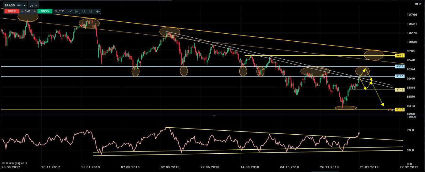 En el último informe comentamos que “a diferencia del DAX, el IBEX si mostraba divergencias alcistas en los indicadores técnicos semanales, lo que podía ser un primer síntoma de un rebote algo más duradero tanto en tiempo como en extensión. Pero que el rebote de las últimas dos semanas había llevado al IBEX hasta la zona pivote entre 8817 y 8904, y al RSI a su directriz bajista. Y que con estas señales, parecía difícil ver extensiones al alza adicionales a corto plazo, aunque podría ser que viésemos un potencial ataque a la directriz bajista del precio en 9030-40 para luego ver un nuevo impulso hacia la zona de mínimos anterior. Dijimos que a medio/largo plazo, mientras el índice cotizase por debajo de 9400 el escenario continuaba siendo claramente bajista”. Finalmente el IBEX se decantó por el escenario más positivo, alcanzando su directriz bajista. Desde aquí surge el riesgo de un rechazo y corrección hacia 8749. En el caso de perderse este nivel la tendencia bajista seguiría intacta y el objetivo más probable es un nuevo ataque a la zona de mínimos de diciembre. En el caso de que precio continuase al alza rompiendo la línea de tendencia bajista, espero un ataque a la zona de resistencia clave pero no espero una superación de 9374 sin que antes se produzca una corrección a la baja significativa.