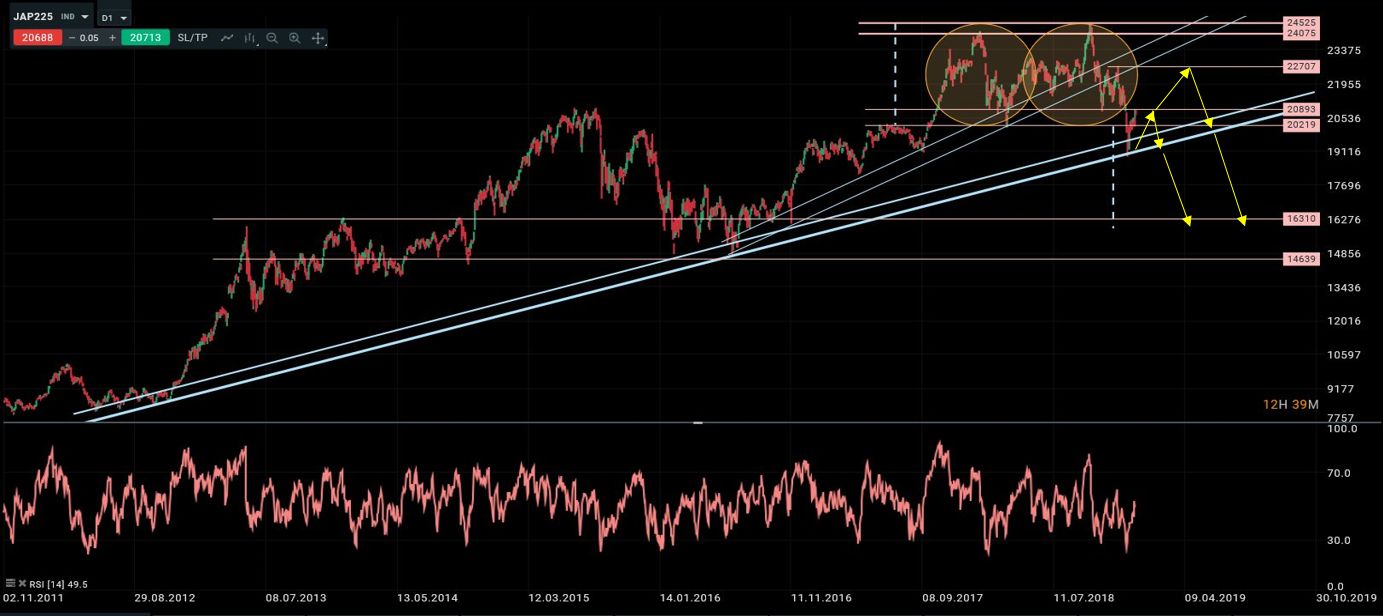 En el informe anterior comentamos que “el Nikkei había completado una formación de vuelta tipo doble techo cuyas implicaciones era claramente bajitas. Y que lo único positivo era que todavía seguía intacta la directriz alcista que se inició en 2012. Barajamos tres posibles escenarios: 1) que el rebote de la última semana tan solo fuese un “pullback” al “neckline” y que por tanto no se produjeran extensiones por encima de 20900 antes de retomarse la presión vendedora con objetivo final en 16000. Escenario 2) que el rebote se extendiera por encima de 20900, lo que abriría la posibilidad de subidas hacia 22700, (último máximo decreciente). Pero en cualquiera de los casos, dijimos que mientras no se superase este techo, el riesgo a la baja seguía intacto por lo que había que buscar oportunidades de venta”. No ha habido ningún cambio significativo en nuestro análisis por lo que mantenemos la misma idea que la semana pasada.