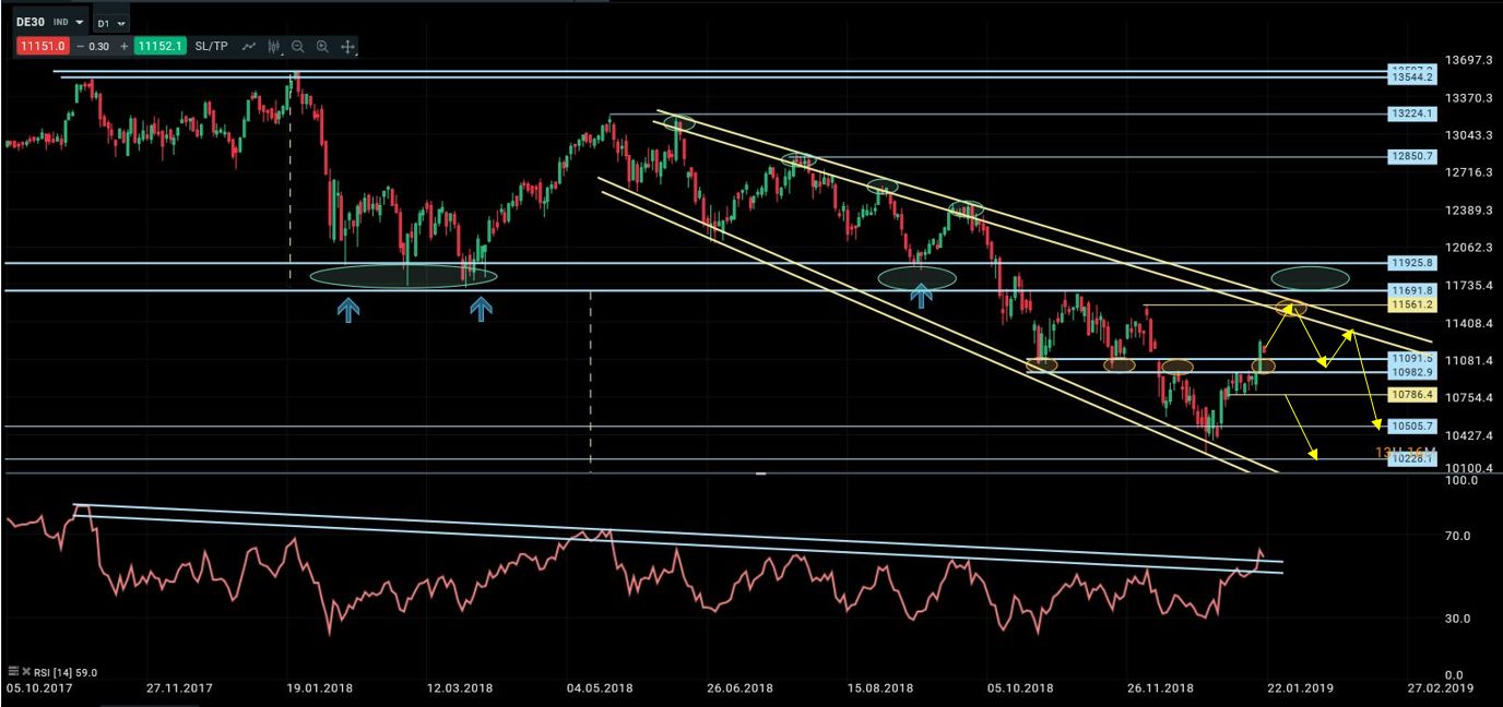 En el informe anterior comentamos que “teniendo en cuenta la situación sobrecomprada de los indicadores técnicos, la directriz intacta a la baja en RSI, el desarrollo en a-b-c del rebote, la ausencia de formaciones de vuelta en los mínimos y como han sido los suelos de la bolsa estadounidense en las últimas 6 ocasiones en que ha corregido con fuerza, el escenario que considerábamos más probable era un nuevo movimiento a la baja para re-testear la zona de mínimos en torno a 2315, o al menos hacia 2440/50, antes de ver un nuevo intento de rebote”. Durante la semana, sin embargo, la bolsa estadounidense ha continuado su ascenso espoleada por las declaraciones “dovish” de la FED que indican una parada en el proceso de subidas de tipos este año. La superación de la zona de resistencia y de la directriz en RSI son síntomas claramente positivos. El siguiente nivel de techo está muy cerca, (la directriz bajista que une los últimos máximos decrecientes). Desde aquí podríamos ver un proceso correctivo hacia la zona de soporte 2521 que se encuentra entre el 38-50% de corrección de toda la subida de este año. Este es nuestro escenario base, si bien es cierto que hay que plantear otras opciones, como la posibilidad de ruptura de la directriz bajista lo que provocaría una extensión hacia 2810-25, o por el contrario que la corrección desde la directriz bajista acabe perdiendo el soporte en 2443 lo que advertiría de un nuevo re-testeo de los mínimos alcanzados en diciembre del año pasado. A medio plazo, no hay que olvidar que el índice mantiene una secuencia de máximos y mínimos decreciente, y que se han roto directrices alcistas activas desde 2009, por lo que el riesgo principal sigue siendo a la baja.