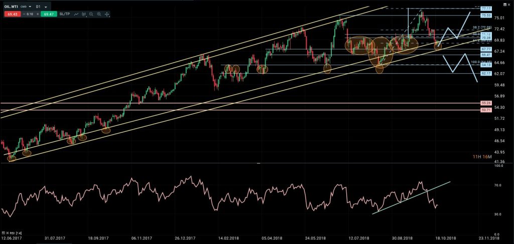 En el último informe comentamos que “la caída del petróleo había respetado nuestra zona de compra en torno al 50% de corrección de Fibonacci y antigua área de máximos previos. Y que desde ahí esperábamos que se retomase un nuevo impulso con un primer objetivo en los techos anteriores en torno a 77.15/20. También dijimos que a largo plazo, cada vez eran más importantes las divergencias bajistas que se estaban desarrollando, por lo que habría que ser cada vez más cautos y fijar los stops en previsión de un potencial cambio de tendencia durante las próximas semanas. Por último mencionamos que mientras el precio se mantuviese por encima de 66.40 el escenario positivo seguía siendo el que más sentido tenía”. Durante la semana pasada el precio continuó su corrección a la baja alcanzando la zona del 61.8% y lo que es más importante aun, la directriz alcista que arranca de mediados de 2017. Pese a la caída adicional, no se detectan formaciones de vuelta ni cambios en la secuencia de máximos y mínimos crecientes, por lo que mantenemos nuestra visión positiva, ciñendo el stop por debajo de 66.40.