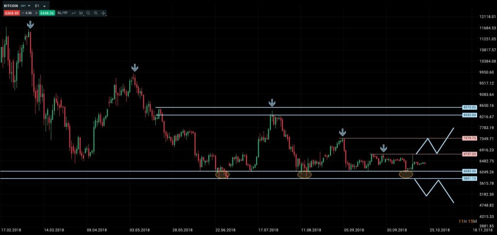 En el último informe comentamos que “la zona 5800/6100 era un soporte realmente crítico a medio plazo, ya que había frenado todos los ataques bajistas desde principios de año. Y que si alguna vez se rompía este suelo, comenzaríamos a generar mínimos decrecientes además de los máximos decrecientes que ya tenemos, por lo que habría que esperar caídas adicionales fuertes, (hacia 3000 a largo plazo). También dijimos que para que la situación actual se tornase más positiva era necesario que se produjesen cierres por encima de 6760. Y que solo en ese caso surgiría una opción de trading al alza con objetivo en 7280”. La última semana hemos visto la cotización de Bitcoin muy estable, en una zona neutra entre el gran soporte y la primera resistencia fuerte. Por tanto, mantenemos el comentario anterior porque no hay cambios significativos.