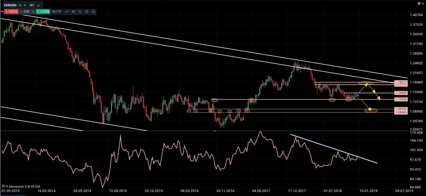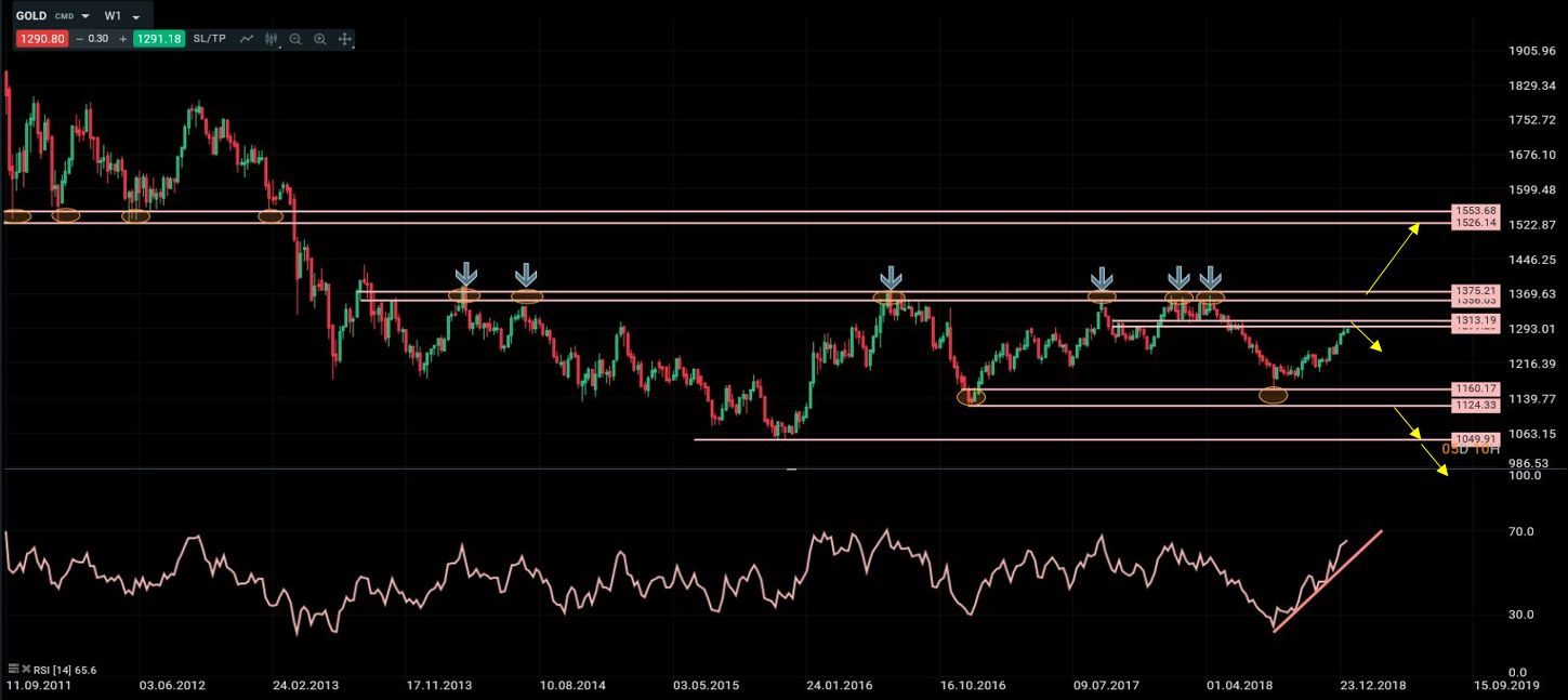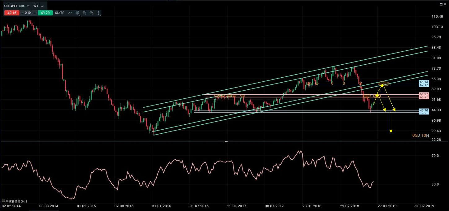 El petróleo sufrió un desplome espectacular durante los últimos meses del año 2018, rompiendo la estructura alcista que había mantenido desde finales de 2015. A partir de ahí el entorno se ha vuelto claramente bajista de nuevo. Sin embargo, la situación de extrema sobreventa unido a la importancia del soporte en 42.70/43.00 están permitiendo los primeros rebotes tácticos significativos. Todavía espero que dichos rebotes se extiendan en duración antes de que se retomen las presiones bajistas otra vez. La primera zona donde buscar oportunidades de venta se encuentra entra 53.50 y 55.30. A largo plazo, se ha configurado una zona de resistencia muy importante en torno a 62.00 que no creo que se vaya a ver superado en mucho tiempo, y por tanto representa una zona “idónea” donde buscar estrategias bajistas de largo plazo.
