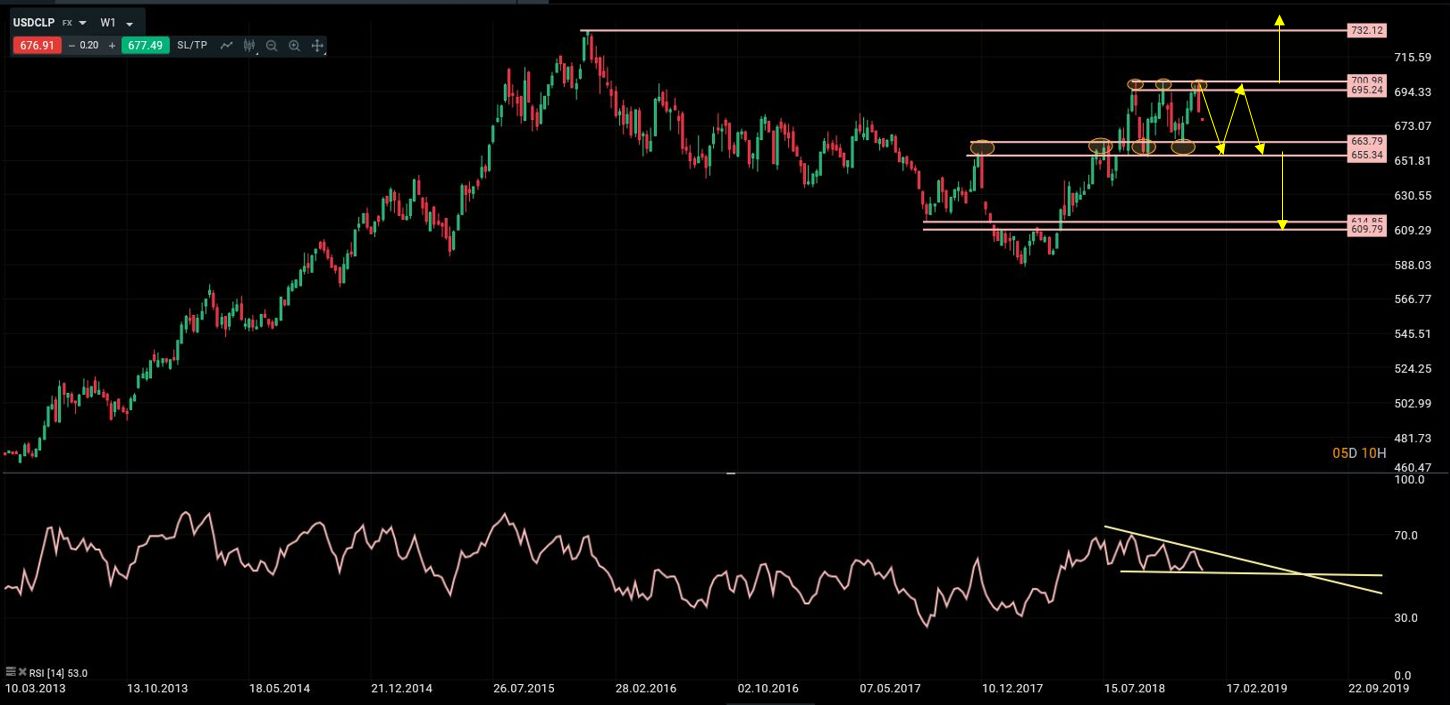 El usdclp ha entrado en una fase de consolidación lateral entre 655 y 701. Pese a los intentos de ruptura de la zona de máximos los indicadores técnicos siguen generando divergencias bajista lo que hace probable que el periodo lateral se extienda un tiempo más. La salida de este rango determinará el próximo movimiento tendencial fuerte. En el caso de que se consoliden cierres por encima de 701 espero una primera extensión hacia 732/740. Por el contrario, si se producen cierres por debajo de 655 la fase lateral actual se convertiría en una formación de vuelta bajista, lo que implicaría caídas a medio plazo hacia la zona 610/615.
