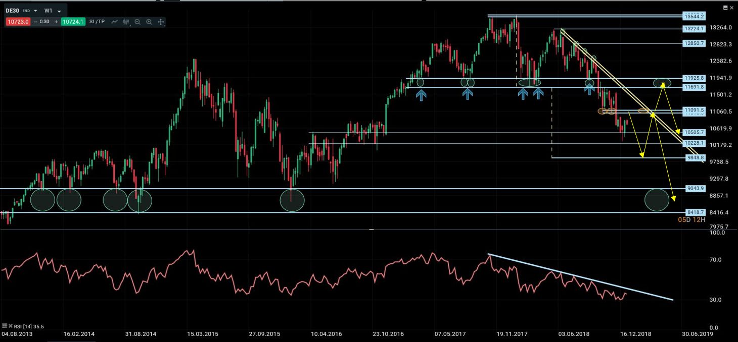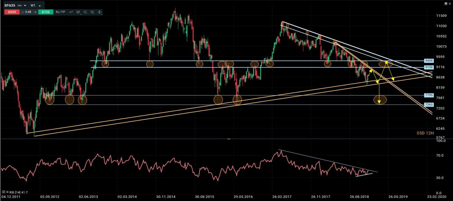 El DAX completo en 2018 una formación de vuelta tipo h-c-h y la ruptura de la directriz alcista de largo plazo. El objetivo de la formación es la zona en torno a 9850. De momento no se aprecian divergencias semanales que adviertan de un potencial rebote inminente, pese a la situación de sobreventa actual. Mientras el índice cotice por debajo de 11090/11100 el entorno continúa siendo claramente bajista tanto a corto como a medio plazo. Los niveles críticos por abajo son, el área pivote entre 10225 y 10500, y si no aguanta la zona de soporte estructural de 2013, 2014 y 2015 entre 8400 y 9000 puntos. Para reducir la presión negativa actual sería necesario que el DAX rompiese al alza la cota de 11100 y la directriz bajista que se inició a mediados de 2018. En ese caso podríamos plantear recuperaciones hacia los 11700/900 puntos de nuevo, donde surgirían otra vez grandes oportunidades de venta para el medio/largo plazo.