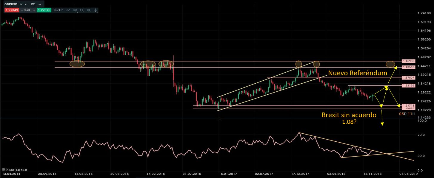 La situación en torno a la Libra es la más incierta de todas. El 15 de enero se somete a votación el preacuerdo del Brexit en la Cámara de los Comunes en Reino Unido. Tras el fracaso de May de someter a votación dicho acuerdo en diciembre y el intento fallido de renegociar los términos del contrato con Bruselas, ahora parece muy difícil que vaya a conseguir los apoyos necesarios para sacarlo adelante a mediados de este mes. Caben todo tipo de escenarios pero voy a intentar resumirlo en tres. Escenario 1) si se aprueba el acuerdo en el parlamento, espero que la libra rebote hacia 1.33, como muestra de una menor incertidumbre en el mercado. Escenario 2) que no se apruebe el preacuerdo, Theresa May sigue gobernando y la separación con la UE se hace sin un acuerdo marco. Sería desastroso en términos económicos y la incertidumbre se dispararía. En este caso espero que la libra se hunda y probablemente veríamos caídas hacia 1.15 primero y 1.08 a medio plazo. Escenario 3) que no se apruebe el preacuerdo y que Corbin lance una moción de censura contra May que le obligue a dimitir. Si el nuevo Primer Ministro se atreve a dar marcha atrás y convocar un segundo referéndum, el mercado descuenta una alta probabilidad de que UK no abandone la UE, lo que provocaría una fuerte apreciación de la Libra, que probablemente recuperaría niveles anteriores al primer referéndum, en el entorno de 1.4350/1.4400.