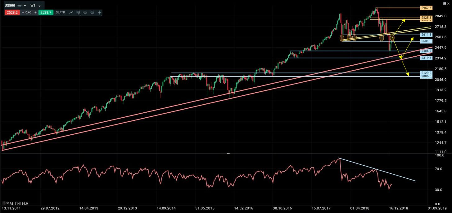 El mes de diciembre provocó grandes daños a la estructura de largo plazo de la bolsa estadounidense. La ruptura de 2530 provocó una caída violenta hasta la siguiente zona de soporte, 2320/2400, por donde pasa la directriz alcista que se inició en 2011. Las declaraciones del presidente de la FED han facilitado un primer rebote a corto plazo. Sin embargo, con ausencia de divergencias alcistas no creo que el impulso actual vaya a durar mucho más. El escenario que considero más probable es un rechazo de la zona de resistencia entre 2530/2610, lo que debería dar paso a un nuevo ataque a la directriz alcista. Los dos niveles críticos que habrá que vigilar de cerca son 2610 por arriba y 2320 por abajo. Cierres por encima de 2610 abrirían extensiones hacia 2800 de nuevo. Por el contrario, cierres por debajo de 2320 evidenciarían un cambio de tendencia de medio/largo plazo, en cuyo caso habría que esperar caídas adicionales hacia la zona de 2100.