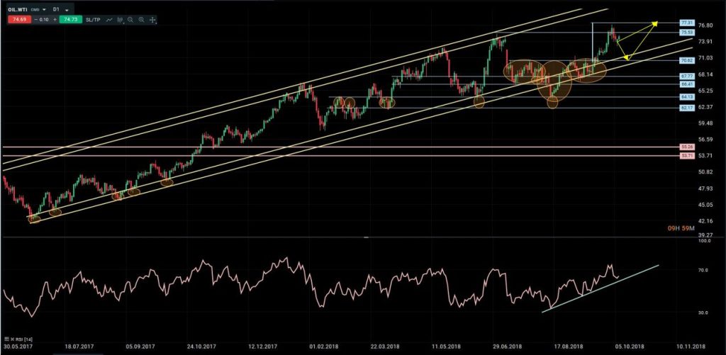 En el último informe comentamos que “con la ruptura de 70.60 el proceso alcista se consolidaba, y esperaría impulsos hacia 75.00/25 para cerrar el resto de las posiciones largas.” Estas últimas dos semanas han sido claramente alcistas para el petróleo, y el precio se ha extendido hasta nuestra zona objetivo, cumpliendo con la proyección de la formación (hombro-cabeza-hombro de continuación). En este momento no se aprecian formaciones de vuelta o divergencias, por lo que hay que seguir en un entorno de comprar las correcciones. Aprovecharía si se dan vueltas a 70.60/80 para comprar con objetivo en 77.30 y stops por debajo de 66.40.