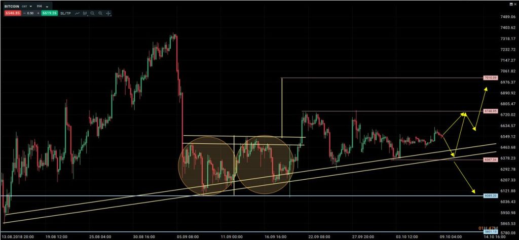 En el último informe comentamos que “se observaba en el gráfico de muy corto plazo (gráfico 4 horas), un pequeño doble suelo. Dijimos que para los traders más agresivos se puede intentar una compra en torno a 6500/6550, con objetivo en 6950/60. Pero que para los traders más conservadores, esperaría una caída hasta 6100/6130 antes de intentar abrir posiciones largas. Además insistimos en que a largo plazo, si se producían cierres por debajo de 5700 se abrirían escenarios muy negativos con objetivo en 3000.” De momento el máximo que ha marcado Bitcoin es 6750, y aunque anda lejos del objetivo del doble suelo, lo cierto es que se aprecia una secuencia clara de mínimos crecientes. Mientras no se rompa dicha secuencia podemos ver nuevas extensiones al alza. Conclusión: mantendría la visión positiva con objetivo en 6950/60 pero con un stop por debajo de 6360, ya que si se pierde este punto es muy probable un nuevo re-testeo de 6080/6100.