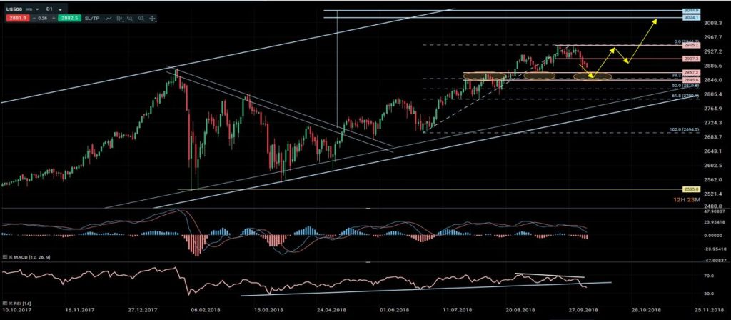 En el informe de hace 15 días comentamos que “no se veían formaciones de vuelta y que no se habían producido rupturas de directrices claves en precio e indicadores. Pero que si se apreciaba una potencial divergencia bajista en el RSI diario. Dijimos que esta señal de debilidad podía provocar alguna corrección táctica, y que en caso de ocurrir había que aprovechar para comprar. Definimos un primer de entrada para los traders más agresivos en 2900/15, aunque mencionamos que el nivel de compra más seguro se encontraba entre 2860 y 2880.” En estas últimas dos semanas se acabó formando un pequeño “doble techo” y se rompió la directriz alcista más acelerada. Esto ha llevado al precio a prolongar su corrección hasta 2865. Este movimiento a la baja lo considero una corrección, y por tanto, una oportunidad de compra. Dada la situación de los indicadores técnicos no sería raro que todavía veamos algo más de presión a la baja antes de reanudarse la tendencia alcista. Intentaría aprovechar caídas hacia 2845-2867 para abrir posiciones largas con dos objetivos: en 2945 y 3000. El stop lo situaría por debajo de 2790.