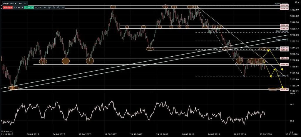 En el último informe comentamos que “de momento la zona de techos entre 1200 y 1215 estaba frenando la recuperación del Oro. Y que mientras no viésemos cierres por encima de 1215 la estructura bajista seguía estando intacta. Además, dijimos que en el caso de que viésemos cierres por encima de 1215 esperaba una extensión hacia 1237/44, pero incluso con esta subida seguía viendo las mejores oportunidades en las ventas y no en las compras”. Durante la última semana el oro no ha sido capaz de cerrar por encima de 1215 por lo que el análisis de este activo no ha cambiado respecto a la semana anterior. Los objetivos por abajo son los mínimos anteriores en 1160 y más a medio plazo 1125.