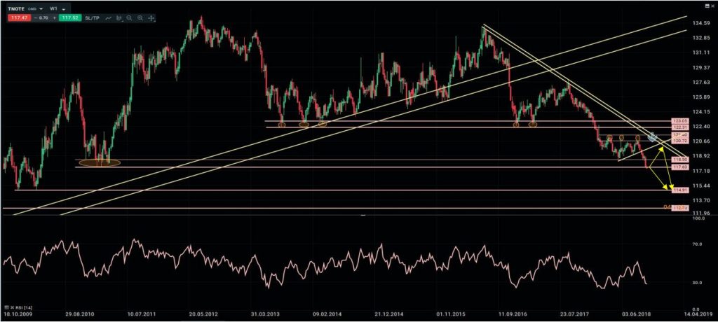 En nuestro último informe comentamos que “la situación era claramente bajista, y que mientras el precio cotizase por debajo de 121.10 y 123.00 había que buscar oportunidades de venta con objetivo en el soporte entre 117.60 y 118.50. También dijimos que a largo plazo, había que tener en cuenta que, cierres por debajo de 117.50 provocarían nuevas extensiones hacia 114.90 primero y 112.80 después. Para invalidar el escenario claramente bajista tendrían que producirse cierres por encima de 123.00. Además vimos que nos estamos acercando al primer objetivo y zona de soporte crítico, por lo que era probable que a corto plazo viésemos algún rebote táctico que podíamos interpretar como “pullback” al triángulo simétrico, para luego seguir bajando”. Durante las últimas dos semanas se produjo un tímido rebote desde 118.30 hasta 119.00 y nuevamente ha surgido la presión vendedora. En este momento nos encontramos en la parte inferior del soporte crítico. La visión general no ha cambiado. Hay que vender los rebotes ya que es muy probable que el precio ataque 114.90 a medio plazo.