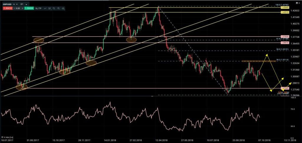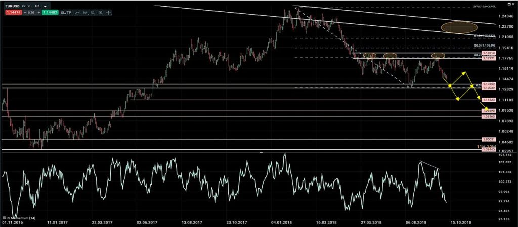 En el último informe comentamos que “dada la tendencia bajista estructural, había que buscar oportunidades de venta. Además se estaba formando una divergencia en los indicadores de “momento” en la zona del 38% de Fibonacci, lo que apoyaba la idea de seguir con un sesgo vendedor. Había dos posibles zonas de entrada: la primera oportunidad para abrir cortos la localizamos en 1.18, con un stop por encima de 1.1870 y un primer objetivo en el mínimo anterior cercano a 1.13. Y la segunda oportunidad de venta, en el supuesto de que el precio se extendiese hasta 1.21-1.22.” Finalmente el EurUsd rechazo la primera zona de techos y va camino de nuestro objetivo en 1.1300/1.1325. Desde ese nivel espero que se produzcan los primeros rebotes significativos, por lo que aprovecharía para cerrar parcialmente las posiciones cortas. En el caso de que el precio consolide cierres por debajo de 1.1300, lo más probable es que veamos extensiones adicionales hacia 1.1120 primero y finalmente hacia 1.0850/1.0950.