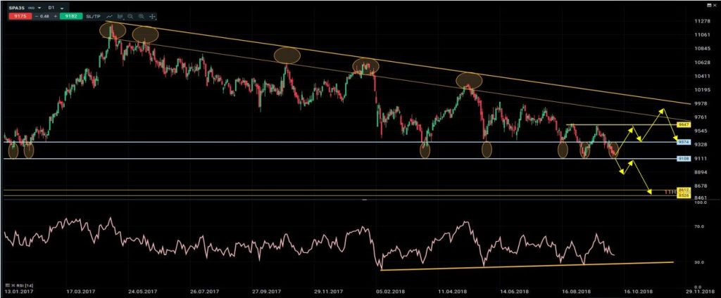 En el último informe comentamos que “el Ibex había alcanzado nuestro primer objetivo en torno a 9650 por lo que aprovechamos para cerrar parcialmente las posiciones de compra. Pero también dijimos que dado que se habían confirmado algunas señales positivas en los gráficos semanales, esperábamos que tras una corrección a la baja, todavía quedase un último desarrollo a medio plazo hacia 9900, donde cerraríamos las compras restantes por completo. Por otro lado, resaltamos que en el caso de que no se produjera este escenario alcista, habrá que estar muy pendientes a posibles cierres semanales por debajo de 9100 ya que en ese caso tendríamos señales claramente bajistas y habría que cambiar la visión positiva que aun mantenemos.” Estas últimas dos semanas han sido claramente bajistas (especialmente para Europa) y el Ibex ha vuelto una vez más a la zona crítica. Al igual que el DAX con su nivel en 11700 el Ibex tiene un soporte muy importante en 9100. Mientras no se rompa dicho suelo podemos mantener nuestra visión constructiva en el corto plazo, con un primer objetivo potencial en 9640/50 y un objetivo final en 9900. Sin embargo, cierres semanales por debajo de 9100 abrirían extensiones a la baja hacia 8525/8615.