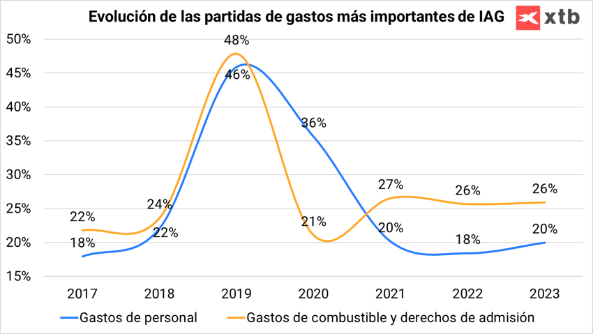 De cara a analizar las acciones de IAG, sin embargo, también debemos fijarnos en dos partidas que copan la mayoría del gasto operativo de la empresa, como son los gastos de personal y de combustible. El porcentaje de los ingresos que representan estas partidas es muy relevante, siendo la del coste del combustible la que puede provocar mayor volatilidad a la cuenta de resultados. En el caso del personal, existe una escasez de mano de obra en algunas áreas del negocio, como el mantenimiento, lo que puede provocar que siga aumentando.