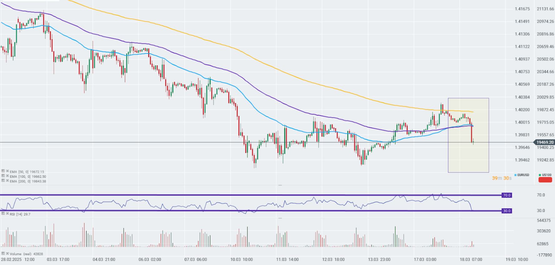 El gráfico indica que las caídas de hoy se producen con un volumen relativamente bajo. Por otro lado, el contrato ha caído por debajo de las importantes medias exponenciales EMA50 y EMA200 en el gráfico horario. Fuente: xStation5