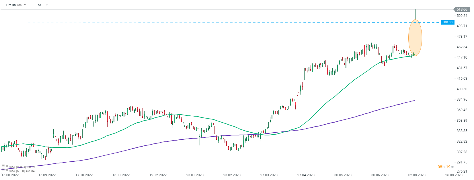 Eli Lilly (LLY.US) repuntó tras las sólidas ganancias del segundo trimestre y la mejora de las previsiones para todo el año. ¡Las acciones subieron más del 13 % en el día, cotizando a nuevos máximos históricos por encima de los $500! Fuente: xStation5
