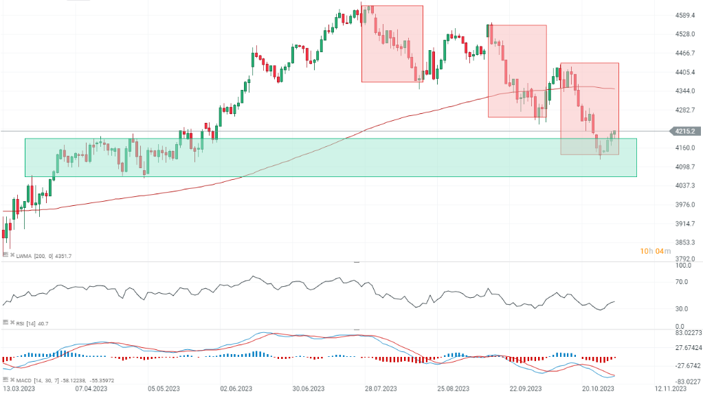 Si observamos el gráfico del S&P 500, podemos ver que si el índice mantiene su estructura actual no está descartada una ruptura alcista de unos 100 puntos, en las proximidades del LWMA 200 entre 4300 y 4350 puntos. La reacción final de los mercados durante la conferencia de Jerome Powell (que comenzará a las 19:30 hora polaca) puede ser decisiva para el futuro sentimiento de los mercados bursátiles. Fuente: xStation5