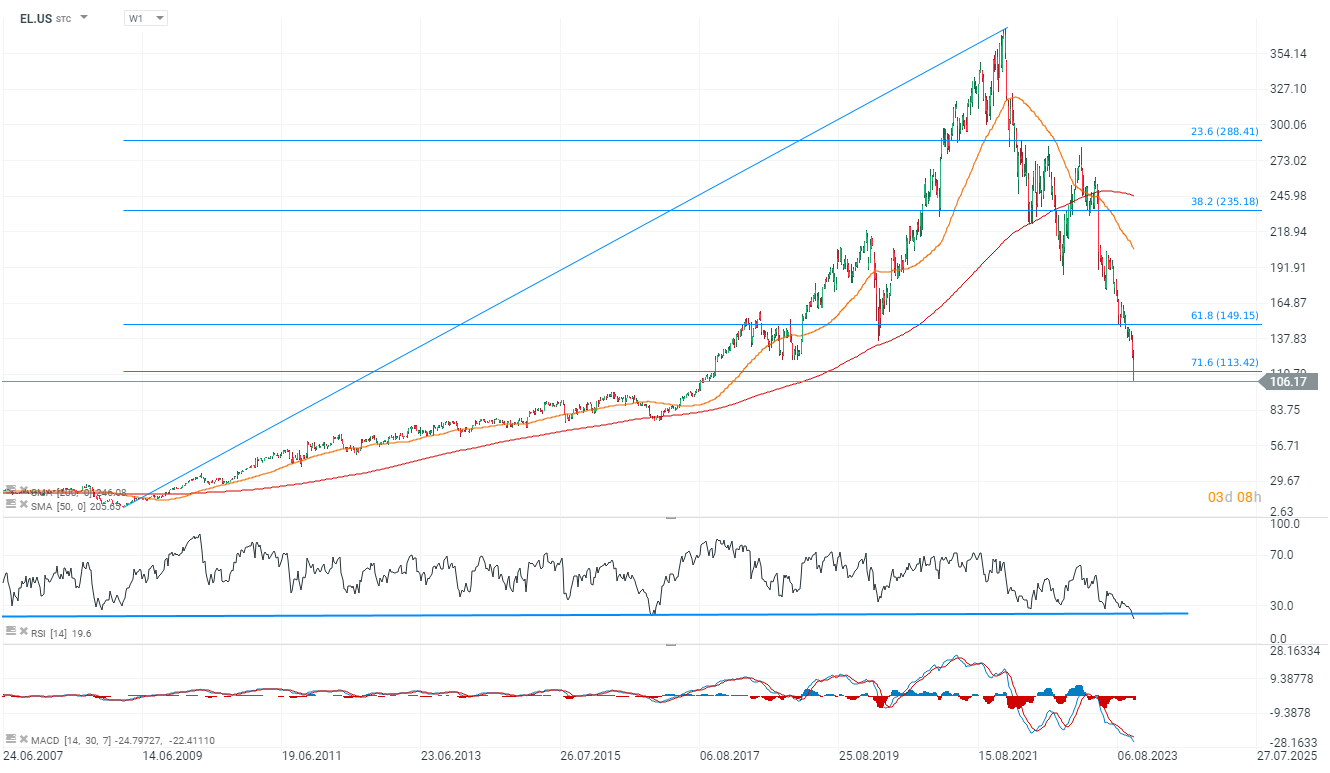 Las acciones de Estee Lauder están experimentando una liquidación sin precedentes, que indirectamente todavía está impulsada por un poderoso aumento en la valoración de las acciones en 2020-2021 y la continua debilidad de los consumidores en China. Los resultados del tercer trimestre fueron mejores en términos de beneficio por acción, que fue de 0,11 dólares frente a una pérdida proyectada de -0,21 dólares, es decir, unos ingresos de 3.520 millones de dólares que no cumplieron con las estimaciones de 3.530 millones de dólares, y la compañía enfatizó que la debilidad de los consumidores en el mercado chino y la tendencia a la baja del gasto en turismo aún persiste.