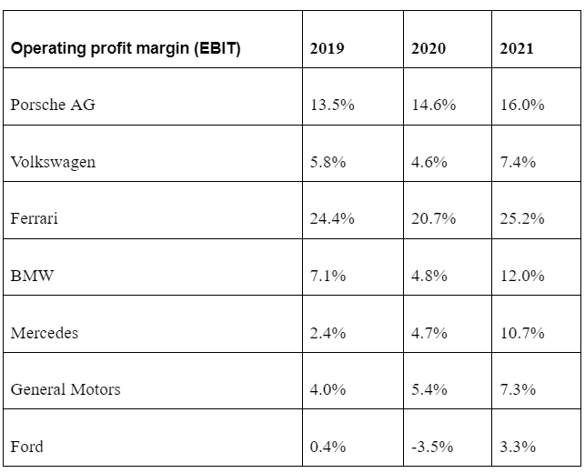 El grupo de competidores identificados de Porsche, a excepción de Ferrari, que posee márgenes superiores de negocio antes de impuestos, muestra unos porcentajes de negocio muy inferiores a los publicados por Porsche. Aunque recordemos que la compañía alemana vende 28 veces más vehículos que la italiana Ferrari.