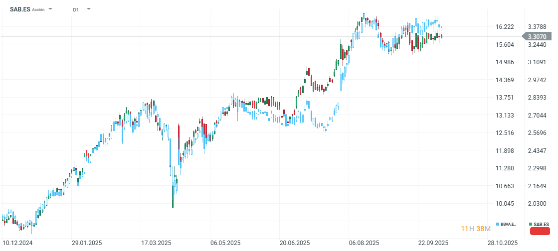 Las acciones de Sabadell (velas verdes y rojas) suben un 77% en este 2025, mientras que las de BBVA (velas azules y blancas) suben un 73%.
