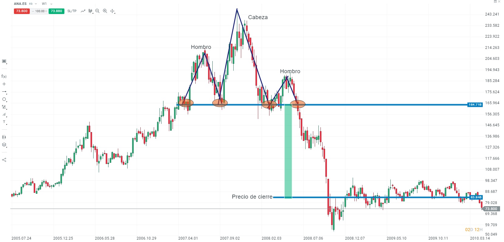 Hombro Cabeza Hombro: Tras una evolución a favor de tendencia, la imposibilidad de batir un nuevo máximo y la consiguiente rotura del soporte clave o clavicular, las esperanzas de una continuación de la tendencia se desvanecen.