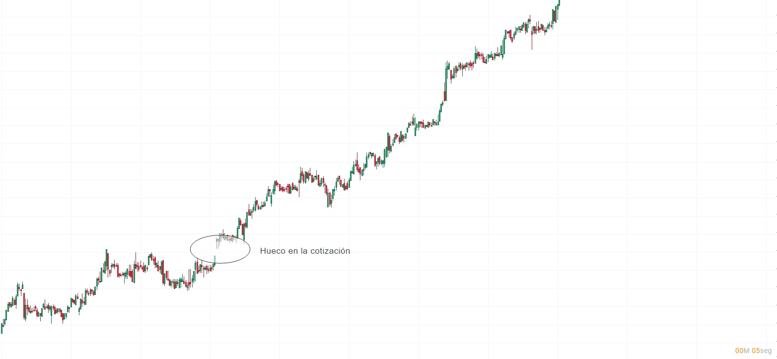 Huecos: Aunque hay muchos tipos de huecos, los más significativos son los que se producen a favor de la tendencia principal y son síntoma de una continuación del signo del mercado.