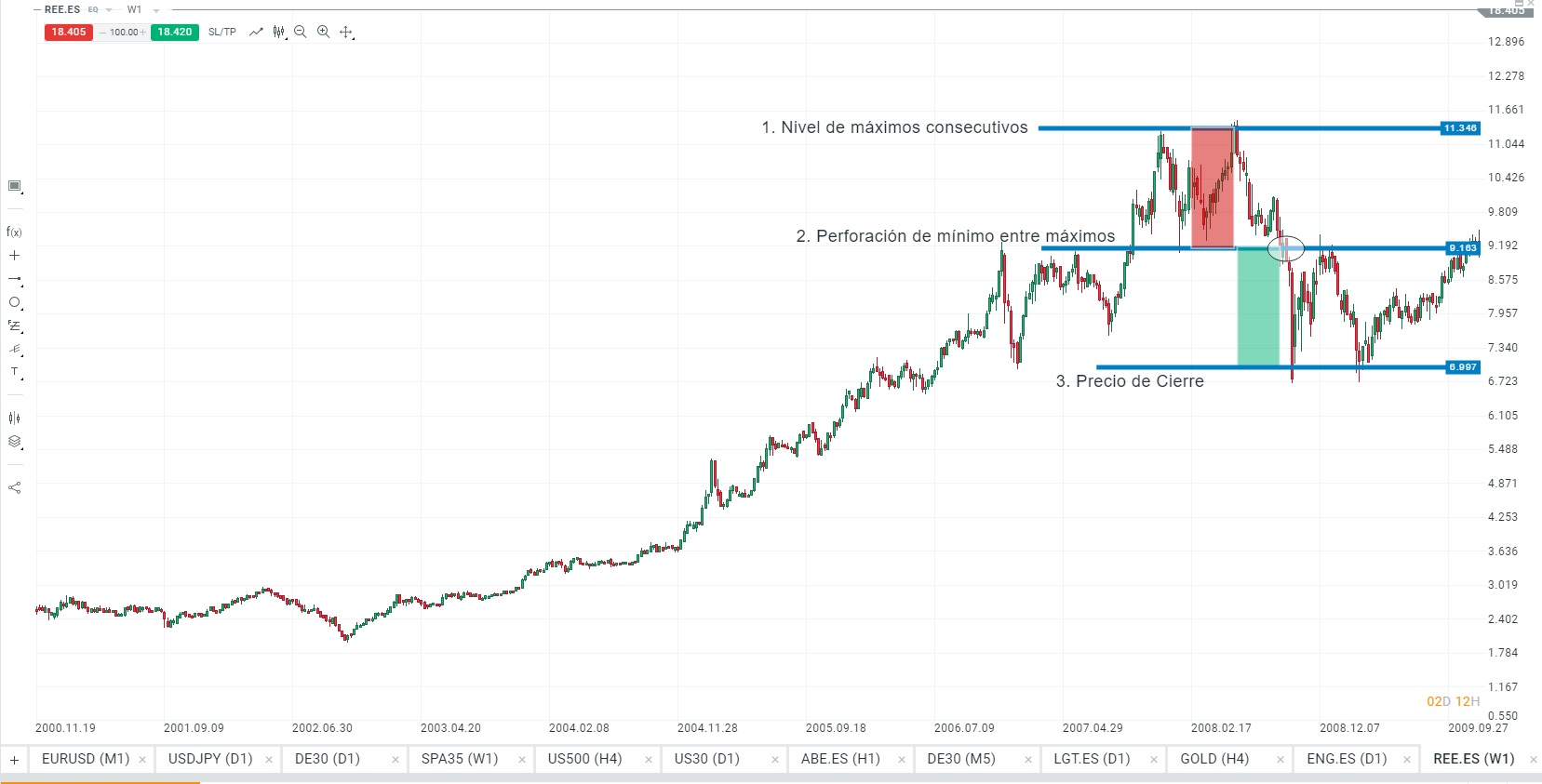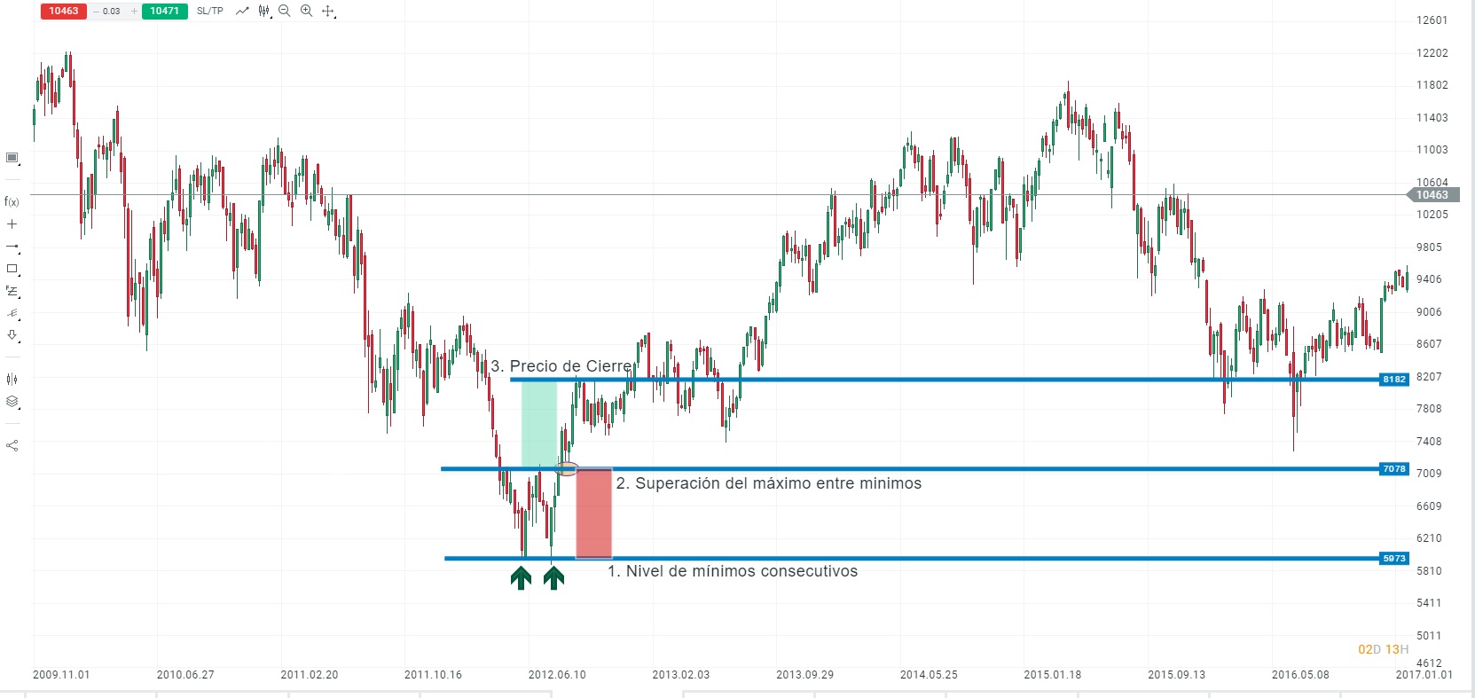 Doble Suelo: Tras una tendencia bajista, la superación de un máximo entre mínimos anticipa entradas de capital en el precio.