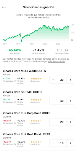 Precisamente para ayudarnos en esta toma de decisiones, es por lo que es especialmente útil contar con una herramienta como la que ofrece XTB, en la que podemos ver cómo se habría comportado nuestro Plan de Inversión en los últimos 5 años en función de los fondos cotizados (ETFs) que escojamos y el porcentaje que les otorguemos así como la pérdida máxima que hubiésemos llegado a tener en este periodo.