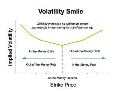 Esto se realiza así para diluir los errores de predicción que se asumen en todos los modelos de valoración de opciones, ya que, tomamos como premisa que las rentabilidades del subyacente siguen una determinada distribución cuando exactamente esto no es del todo correcto. Al dibujo que nos deja la volatilidad implícita al graficarla frente al precio de strike se denomina sonrisa de volatilidad o volatility smile.
