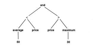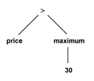Las reglas de trading las representamos mediante estructuras de árbol. Por ejemplo, en la figura 2 podemos observar la regla de trading que "entra en mercado" cuando el precio de la barra actual es mayor que la media de las últimas 50 barras. La función "average" computa la media de n barras en el histórico. El parámetro de la función se especifica mediante el 50 que cuelga como nodo hijo en el árbol. La función "price" nos devuelve el precio de cierre de la barra actual. Por último, podemos observar que el operador relacional "<" especifica la condición de que la media de 50 barras sea menor que el precio de la barra actual, o que el precio de la barra actual sea mayor que la media de 50 barras, según el sentido de lectura. En la figura 3 podemos observar otra regla de trading que "entra en mercado" cuando el precio de la barra actual es mayor que el precio máximo de las últimas 30 barras. La función "maximum" nos da el precio máximo de las últimas "n" barras, en este caso de las últimas 30 barras.