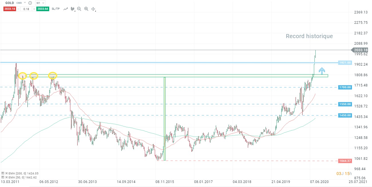 Les marchés minimisent une fois de plus des thèmes tels que la pandémie de coronavirus ou la montée des tensions entre les États-Unis et la Chine, car la saison des bénéfices montre que le deuxième trimestre n'a pas été aussi mauvais que ce que l'on craignait. Le marché boursier américain est en plein essor, deux indices atteignant des niveaux records : l'US100 a atteint un nouveau sommet historique, tandis que l'US500 a atteint un nouveau sommet post-pandémique. De plus, le cours de l'or a dépassé les 2 000 dollars pour la première fois et a atteint un nouveau sommet historique proche des 2 030 dollars, au cœur d'une vague de liquidités bon marché.